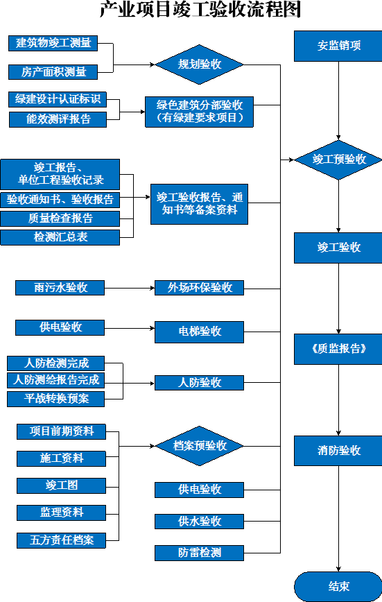 產業項目竣工驗收流程中,人防驗收在人防工程完工后即可最早申請;之后隨工程施工進展,在主體及外場完工后依次申請開展測量測繪及規劃驗收;檔案預驗收及綠建分部驗收一般在土建、安裝、裝修均完成后申請。比較容易出現問題環節和注意事項如下: