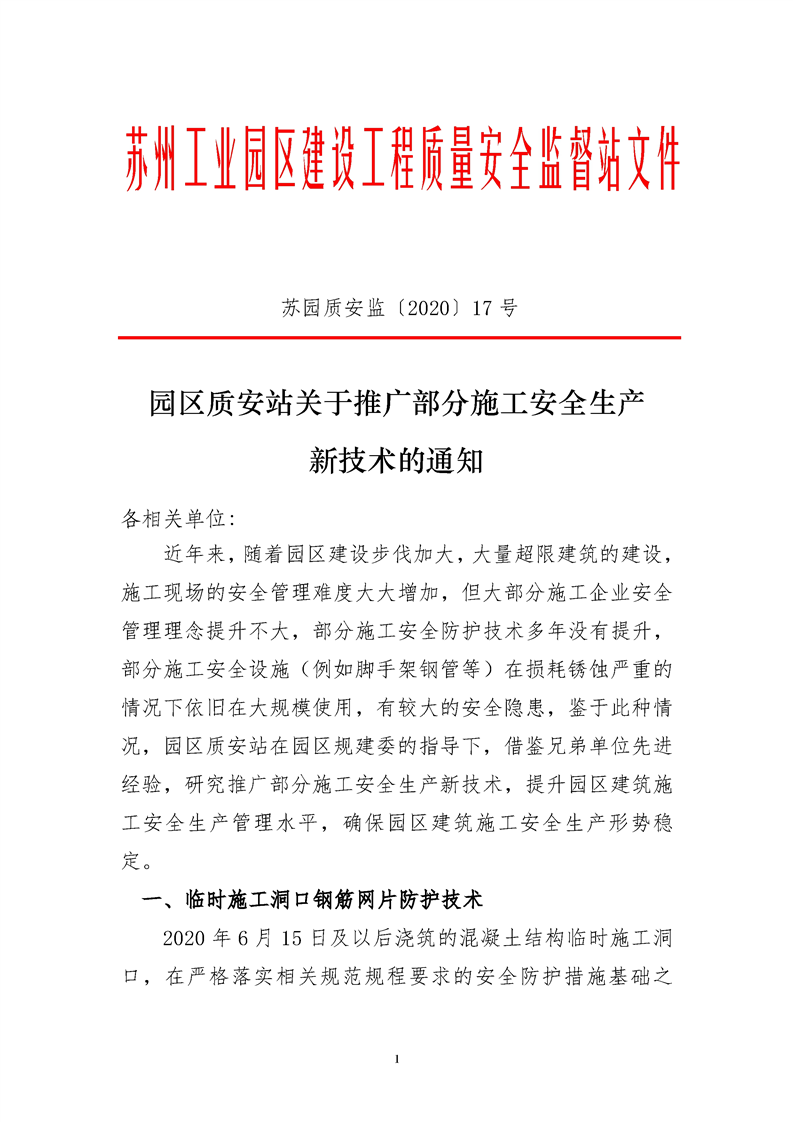 園區(qū)質(zhì)安站關(guān)于推廣部分施工安全生產(chǎn)新技術(shù)的通知
