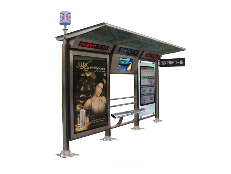 公交車候車亭一般是與公交站牌相配套的,為方便公交乘客候車時遮陽、防雨等,在車站、道路兩旁或綠化帶的港灣式公交停靠站上建設(shè)的交通設(shè)施。由于城市公交的日益發(fā)達(dá),候車亭已發(fā)展成為城市一個不可或缺的重要組成部分,設(shè)計精美的候車亭也成為了城市一道美麗的風(fēng)景。 一般候車亭棚體主要頂棚、立柱、頂弓、廣告燈箱和坐凳組成,也有用隔板來代替廣告燈箱的。