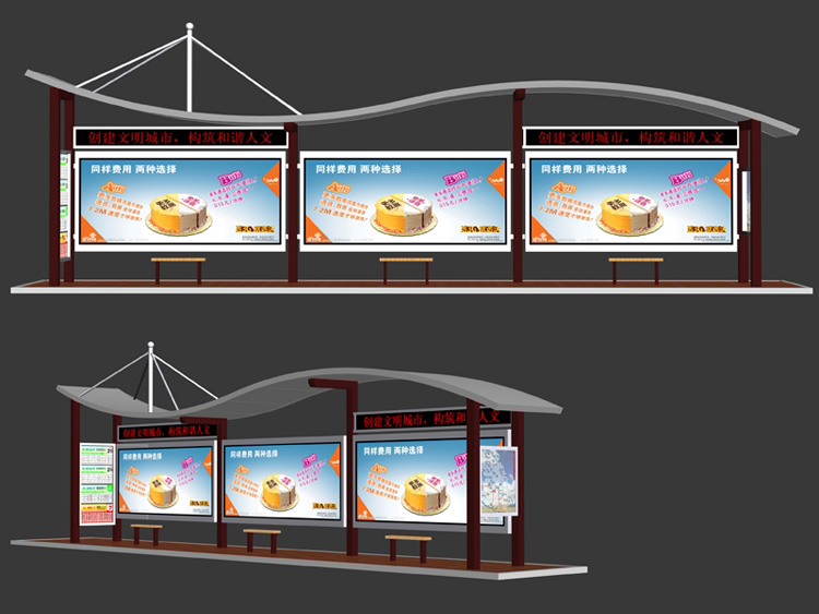 公交車候車亭一般是與公交站牌相配套的,為方便公交乘客候車時遮陽、防雨等,在車站、道路兩旁或綠化帶的港灣式公交停靠站上建設的交通設施。由于城市公交的日益發達,候車亭已發展成為城市一個不可或缺的重要組成部分,設計精美的候車亭也成為了城市一道美麗的風景。 一般候車亭棚體主要頂棚、立柱、頂弓、廣告燈箱和坐凳組成,也有用隔板來代替廣告燈箱的。