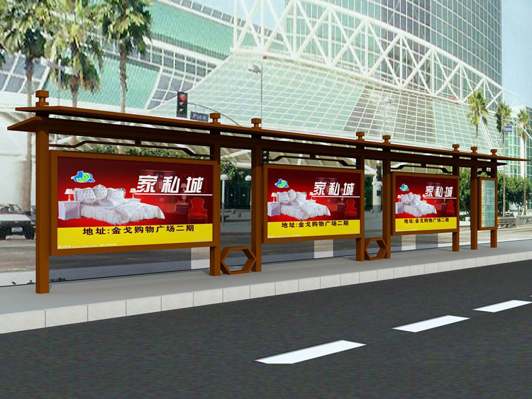 公交車候車亭一般是與公交站牌相配套的,為方便公交乘客候車時遮陽、防雨等,在車站、道路兩旁或綠化帶的港灣式公交?空旧辖ㄔO的交通設施。由于城市公交的日益發達,候車亭已發展成為城市一個不可或缺的重要組成部分,設計精美的候車亭也成為了城市一道美麗的風景。 一般候車亭棚體主要頂棚、立柱、頂弓、廣告燈箱和坐凳組成,也有用隔板來代替廣告燈箱的。