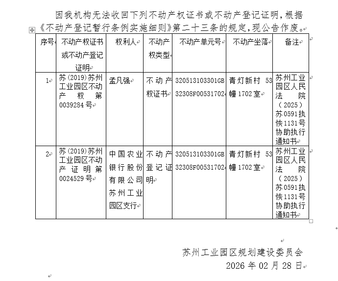 不動產權證書/登記證明作廢公告蘇園 證廢字2026(0053)號(青燈新村53幢1702室)