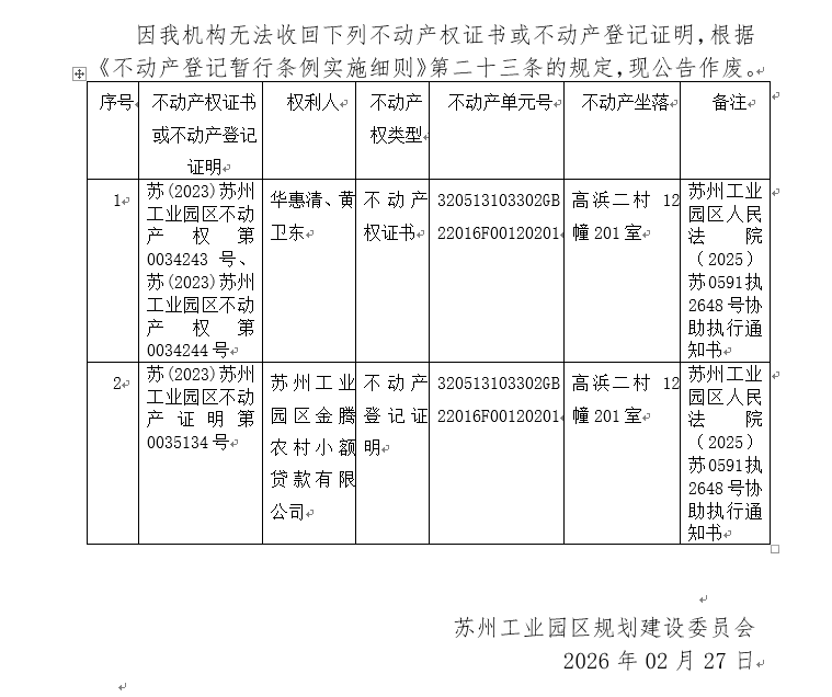 不動產權證書/登記證明作廢公告蘇園 證廢字2026(0049)號(高浜二村12幢201室)