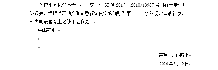 關于古婁一村65幢201室(2010)13987號國有土地使用證遺失聲明