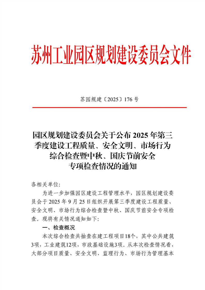 園區規劃建設委員會關于公布2025年第三季度建設工程質量、安全文明、市場行為綜合檢查暨中秋、國慶節前安全專項檢查情況的通知