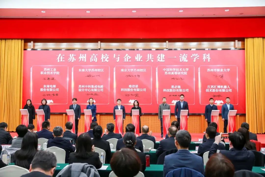 3月16日、匯博ロボットグループは蘇州市職業大學と一流學科共同建設協定に調印した。雙方は産學深層連攜の新たなモデルを共同構築し、新たな質の生産力発展のニーズに適応した高技能人材を育成し、人材チェーンと産業チェーンの深い融合を推進する。匯博ロボットグループは実習設備や技術研究開発などで全方位的なサポートを提供し、産學連攜、先端技術教育、応用人材育成を具體化する。