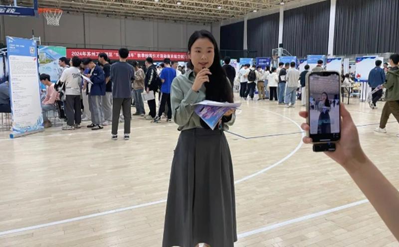 為了進一步提升園區在高校學子中的影響力和知名度,園區在國內部分重點高校招募一批校園主播推介園區,持續放大校園引才效應。本次校招活動中,來自南京航空航天大學的校園主播嚴瑀萌同學連續兩天在校招現場同步進行直播帶崗,實時分享崗位信息,讓求職“觸屏可及”。直播累計曝光8.7萬次,在線觀看人數32869人次,吸引283名粉絲通過直播間加入官方抖音群。
