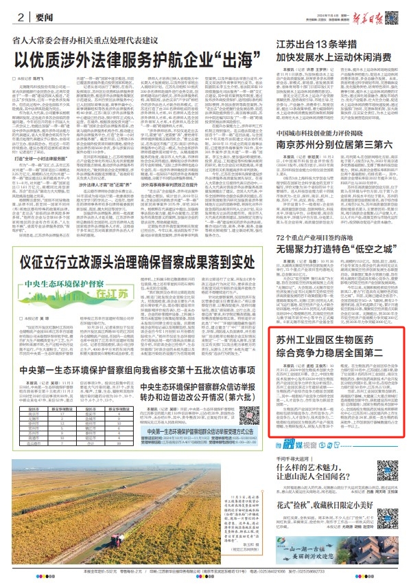 10月31日,2024中國生物技術創新大會在蘇州工業園區開幕。會上,中國生物技術發展中心發布《2024中國生物醫藥產業園區競爭力評價及分析報告》,蘇州工業園區獲近3年最好成績——生物醫藥產業綜合競爭力穩居全國第二,其中一級指標產業競爭力保持全國第一,人才競爭力、合作競爭力躍居全國第一。
