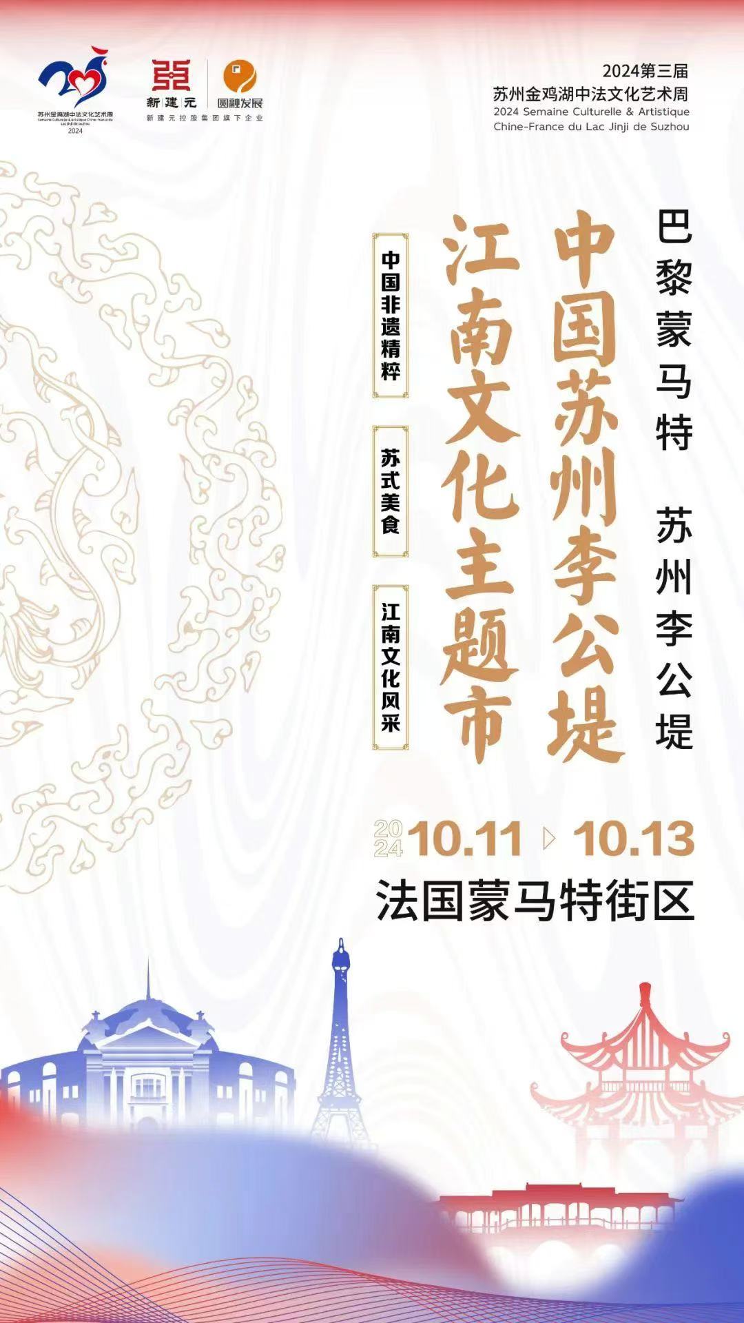 2024第三屆蘇州金雞湖中法文化藝術周于10月5日至20日舉行,市集、巡游、展覽、音樂、芭蕾、電影、文學等一系列活動將陸續在中國蘇州和法國巴黎同步開展,主要呈現法國巴黎四場系列活動和中國蘇州九大主題活動,讓蘇州市民不出國門就能體會地道的法國文化,感受來自法蘭西濃厚的藝術氣息。