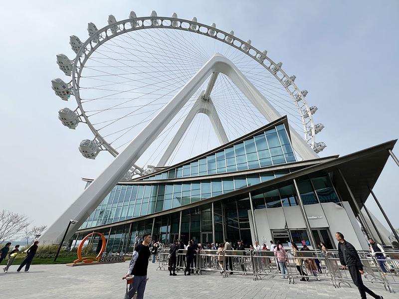 不遠處,“蘇州之眼”摩天輪也在春光里“玩轉”城市的極致浪漫。作為亞洲最大的水上摩天輪,“蘇州之眼”高128米,共設有28個全景轎廂,每個轎廂可容納25人,旋轉一圈約30分鐘,可360°俯瞰金雞湖及園區乃至蘇州全景。