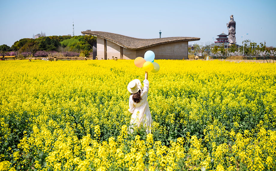 這個清明小長假,草鞋山考古遺址公園內近20畝的油菜花田正值花期,簇簇小花“浮”在綠云之上,肆意綻放田間,一片絢爛金黃,釋放著春的生機與活力。