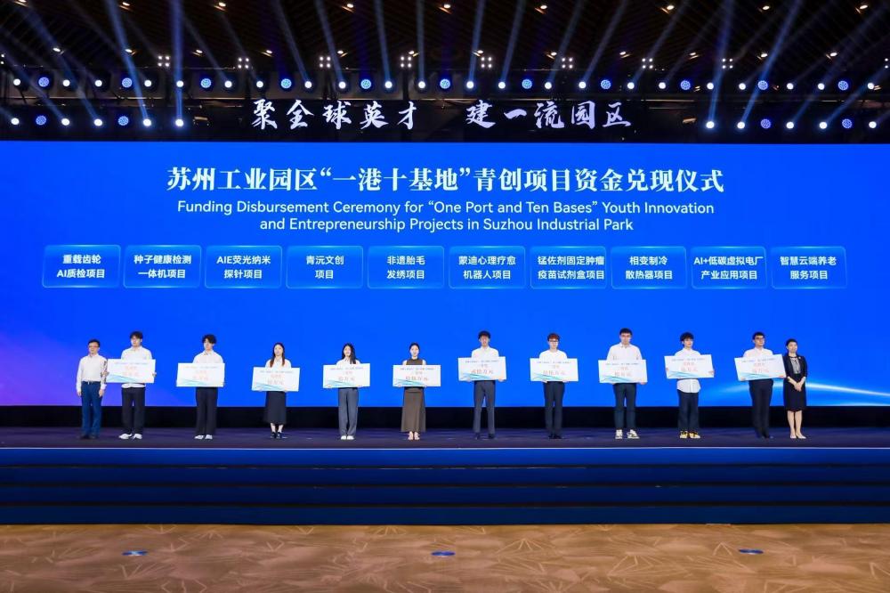 青年是城市發展的活力源泉。開幕式上,園區“一港十基地”青創項目資金正式兌現,為“一港十基地”項目路演一二三等獎及優勝獎等10個獲獎項目兌現青創資金。今年3月,園區發布“園夢未來”青年人才創新創業三年行動計劃,打造“一港十基地”青創空間,新設1億元青創資金專項用于遴選青年人才項目。新政實施以來,累計舉辦56場青創活動,改造4個人才社區,發放415張人才房票,補貼金額超5300萬元,引進青年人才超4萬人。