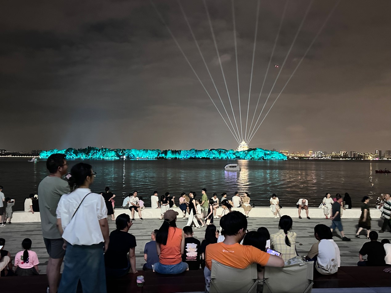 下沉廣場的臺階上,銀發(fā)老人搖動蒲扇,孩童騎在父親肩頭歡呼,情侶依偎享受浪漫,不同年齡、不同身份的觀眾在此共享藝術(shù)狂歡。“我?guī)е⒆邮罴賮硖K州旅游,剛打卡完摩天輪,走到湖邊就被旋律勾住了腳步。”游客魏先生舉著手機(jī)記錄精彩瞬間,“這種露天音樂會太有氛圍了,很接地氣,感覺整個(gè)夏天都鮮活起來,這趟不虛此行。”