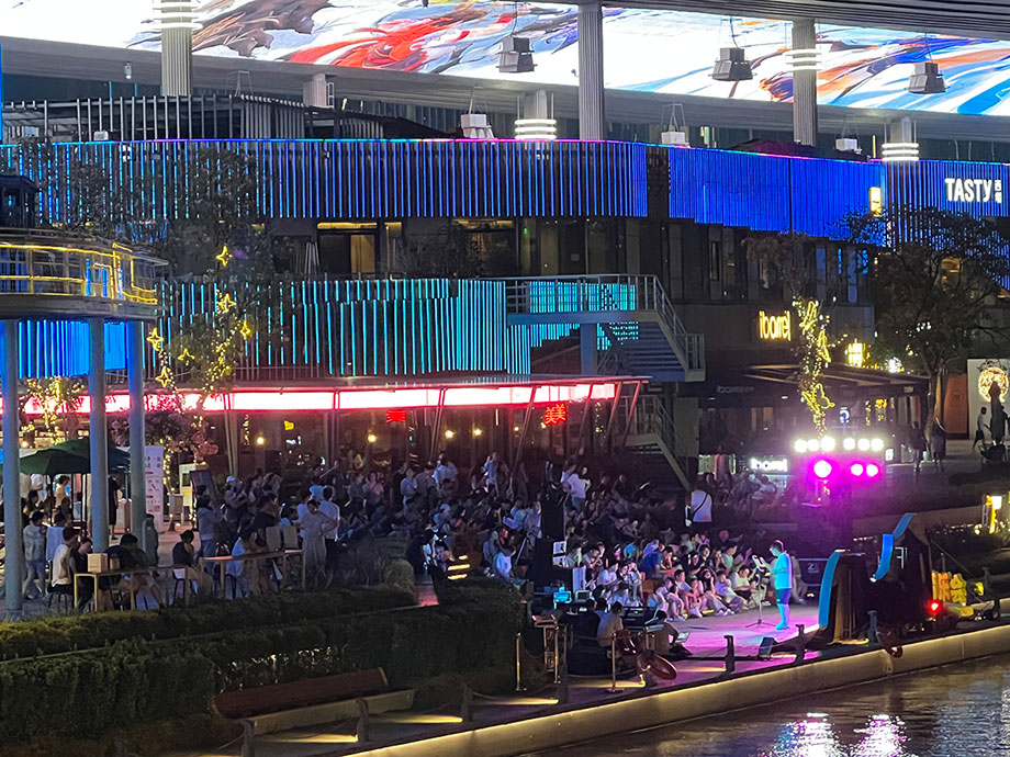 在園區,藝術與人文交織的魅力夏夜并不僅限于右岸下沉式廣場。與“右岸仲夏夜”隔空相應,圓融天幕、月光碼頭等商業載體推出的一場場水岸音樂會,也不斷聚集著人氣與商氣,呈現著國際化新城區別樣的煙火時尚新場景。