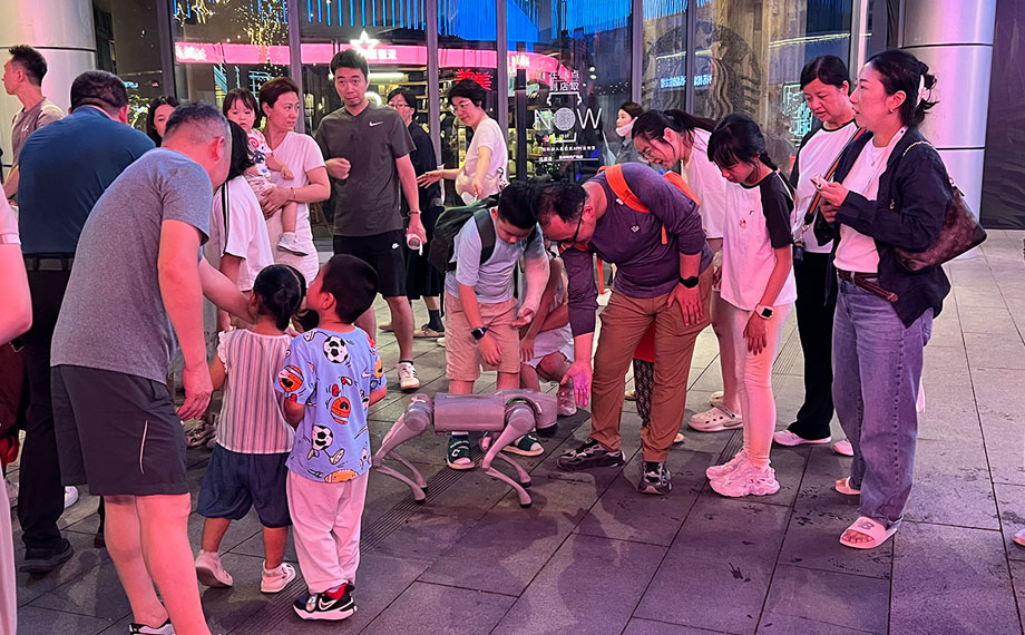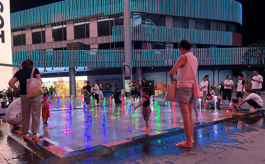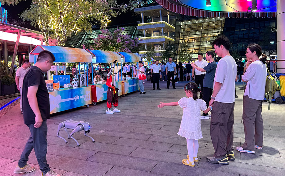 天幕下,變幻著燈光的地面噴泉讓愛玩水的萌娃樂此不疲,而臨近的水岸音樂會甄選市集上,哪吒造型的機器人、身姿靈活的機器狗也與大家握握手、跳個舞熱情互動,讓往來的大朋友、小朋友心動不已?!八兑魳窌e聚人氣,實現了很好的引流,不僅提升了市民的生活質感,也為我們企業推廣搭建了全新的場景。機器人正當熱點,我們與圓融合作,在圓融天幕和月光碼頭都設置了展臺,提供機器人的表演、互動,以及配套小機器人的售賣,對于展示企業形象、能力,展現園區高科技活力,都是很好的平臺?!卑朔綑C器人經理朱錦介紹說。