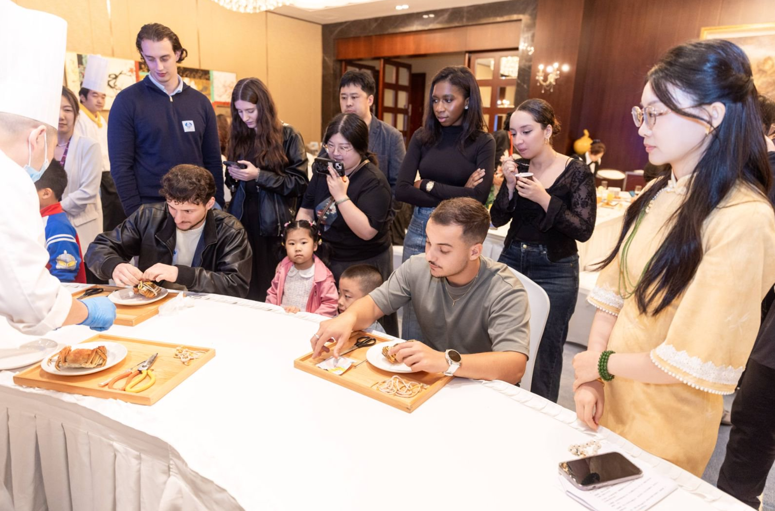 在品嘗美味的同時,豐富多彩的文化互動體驗也吸引著眾多參與者。蘇式綠豆糕制作區里,在大廚的悉心指導下,不少外國朋友親手制作出精致的江南點心;陽澄湖大閘蟹標準拆解演示,則讓食客們領略到江南飲食文化的深厚底蘊。“筷子挑戰賽”和“盲品食物猜猜猜”等互動游戲不僅拉近了彼此的距離,也讓中外文化交流更加輕松愉悅,現場不時傳來陣陣笑聲。