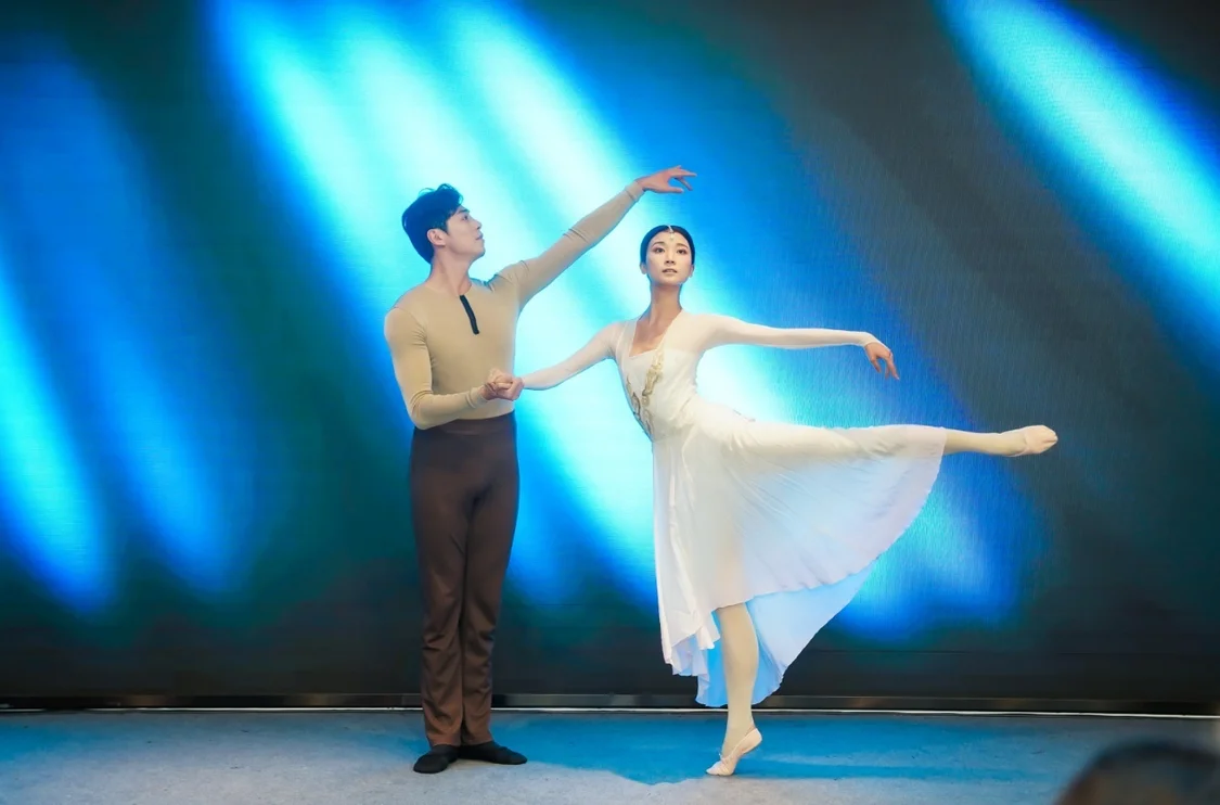 現(xiàn)場,蘇州芭蕾舞團(tuán)以柔美與力量交融的《鵲橋》片段拉開帷幕,藍(lán)調(diào)追光下,舞者裙擺劃出透亮弧線,仿佛將江南水韻融入足尖芭蕾的韻律之中。