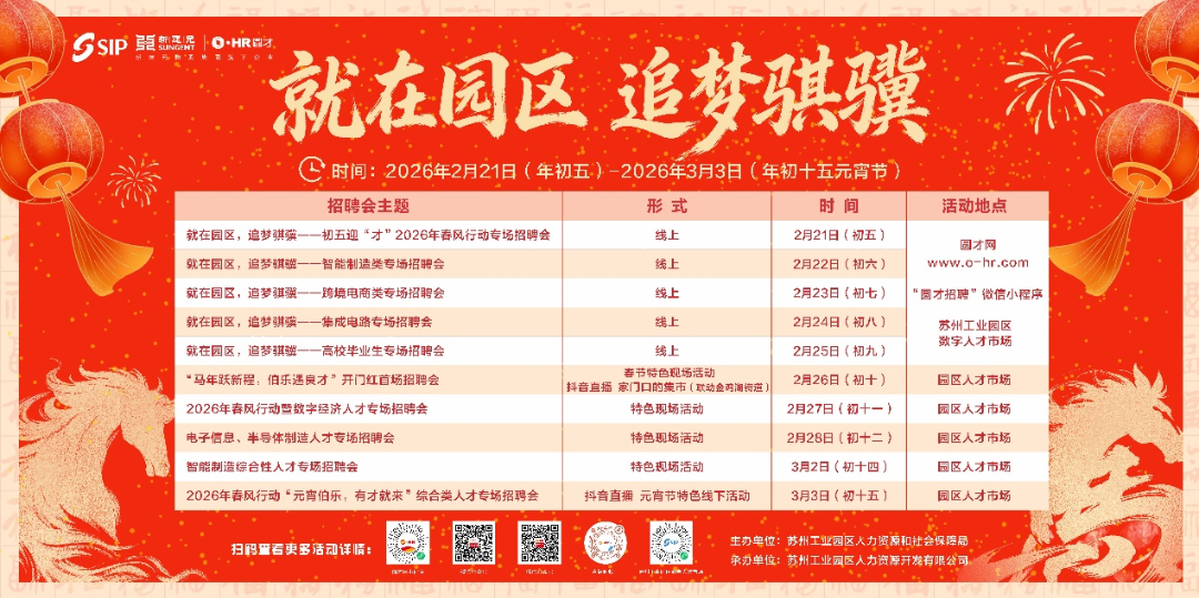 為精準(zhǔn)對接企業(yè)用工與求職者就業(yè)需求,園區(qū)于大年初五至正月十五集中開展“就在園區(qū),追夢騏驥”新春招聘系列活動,包含5場線上招聘會、5場線下招聘會及2場直播帶崗云聘會,全程為企業(yè)提供免費招聘服務(wù)。
