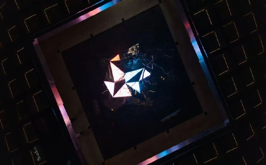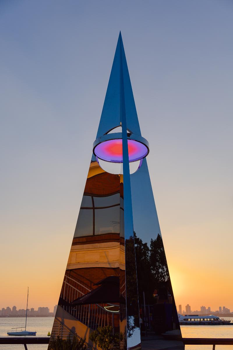 《問(wèn)境》以紙飛機(jī)為靈感、以火箭升空姿態(tài)為造型,主體采用純鏡面不銹鋼材質(zhì),曾先后在深圳、杭州、上海等城市巡展,擁有極高的藝術(shù)口碑。裝置隨天光流轉(zhuǎn)與季節(jié)更迭,倒映出金雞湖的粼粼波影、澄澈天空與城市輪廓,營(yíng)造出錯(cuò)位的空間感。其設(shè)計(jì)暗藏巧思,裝置中心3.84米高處懸掛的圓形天境燈,象征著地月之距,可依自然光譜智能調(diào)光,燈光經(jīng)鏡面折射后,與湖畔夜景交融成一幅靈動(dòng)畫(huà)卷;無(wú)論從何種角度仰望,鏡中皆能望見(jiàn)“完整月亮”,寓意著在萬(wàn)象紛繁中窺見(jiàn)內(nèi)在的完整與純粹。每一次駐足都能捕捉到獨(dú)一無(wú)二的光影畫(huà)面,隨手一拍皆是自帶濾鏡的大片。