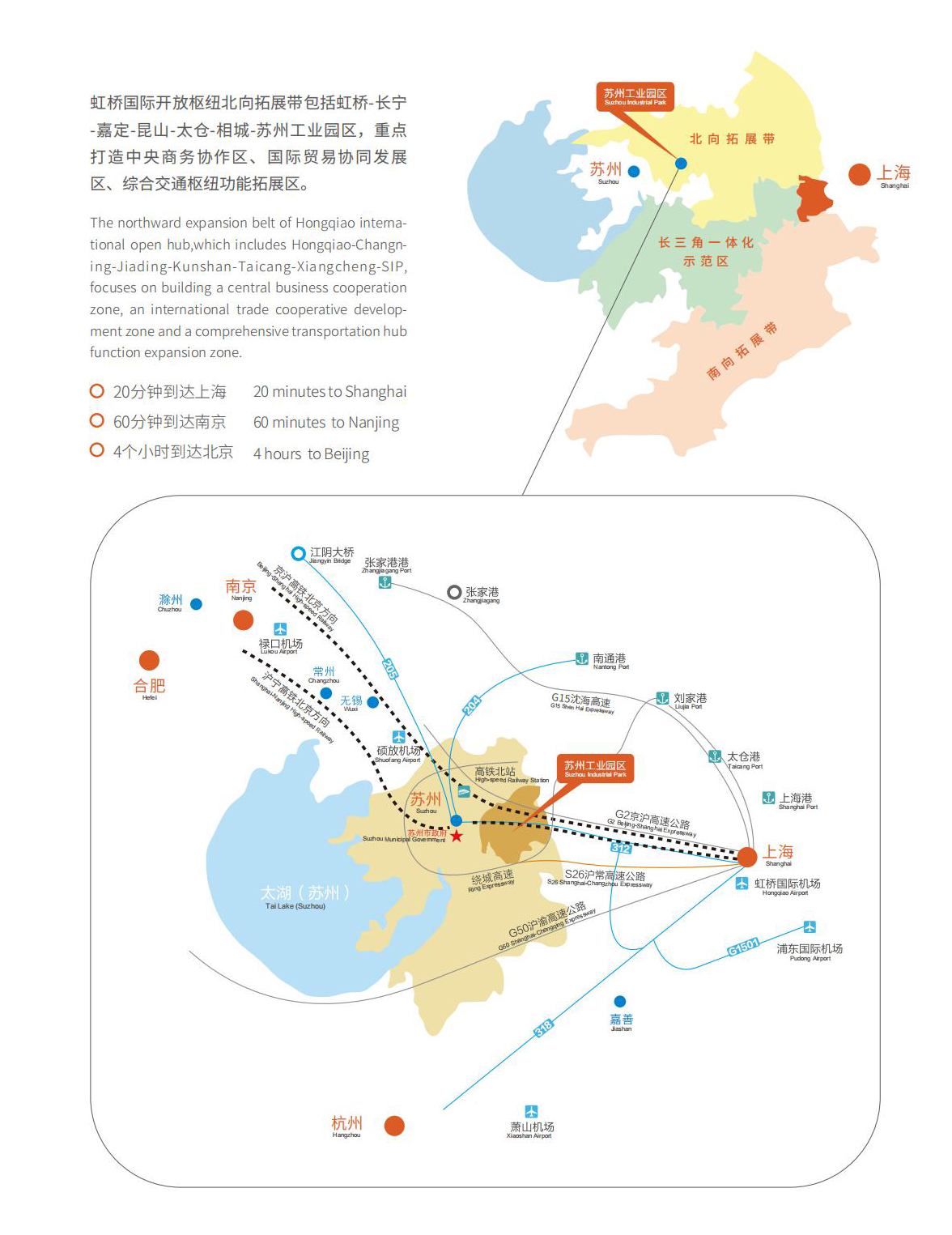 蘇州工業(yè)園區(qū)是蘇州面向未來的城市新中心,以發(fā)達的高速公路、鐵路、水路及航空網與世界各主要城市相連;軌道交通20分鐘到達上海、60分鐘到達南京、4個小時到達北京,是長三角地區(qū)重要的總部經濟和商務文化活動中心,是虹橋國際開放樞紐北向拓展帶的重要一環(huán)。