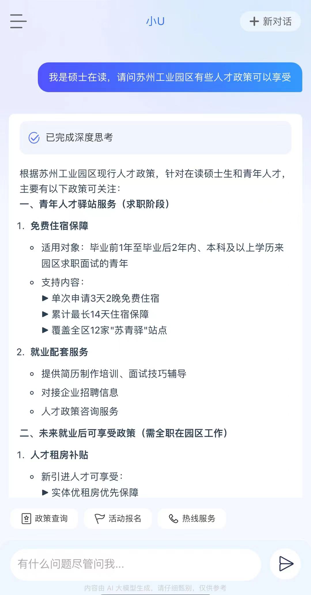 “SIP才無憂”深度聚焦提升人才的使用體驗,通過接入DeepSeek-R1“滿血版”,全新推出首個高智版AI助手“小U”,構建智能化人才服務體系,實現“政策秒配、服務無界”。