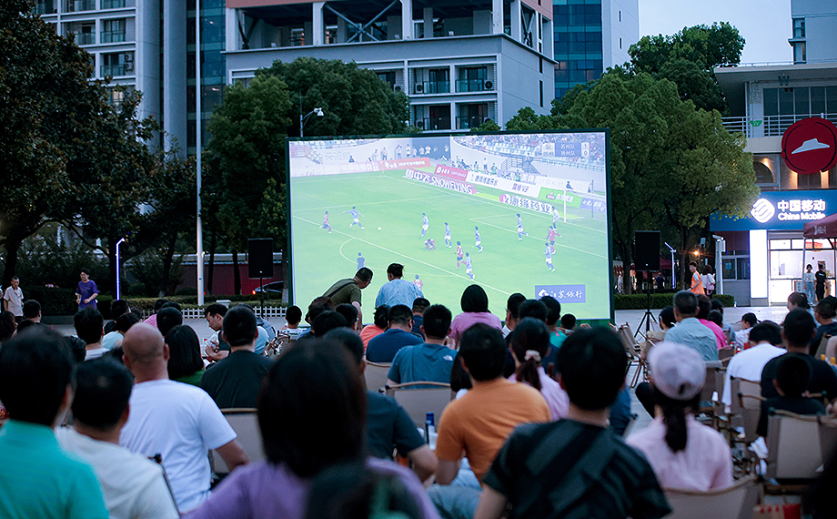 “開始了,開始了!”晚上7點,隨著蘇州隊迎戰揚州隊的哨聲響起,文星廣場的投影前爆發出陣陣歡呼聲。球迷們或坐或站,眼睛緊盯著屏幕上的每一次傳球、射門。每當有隊伍發起進攻,現場便掀起一陣聲浪。比賽開始一分多鐘,蘇州隊的率先進球更是在現場掀起第一波高潮。