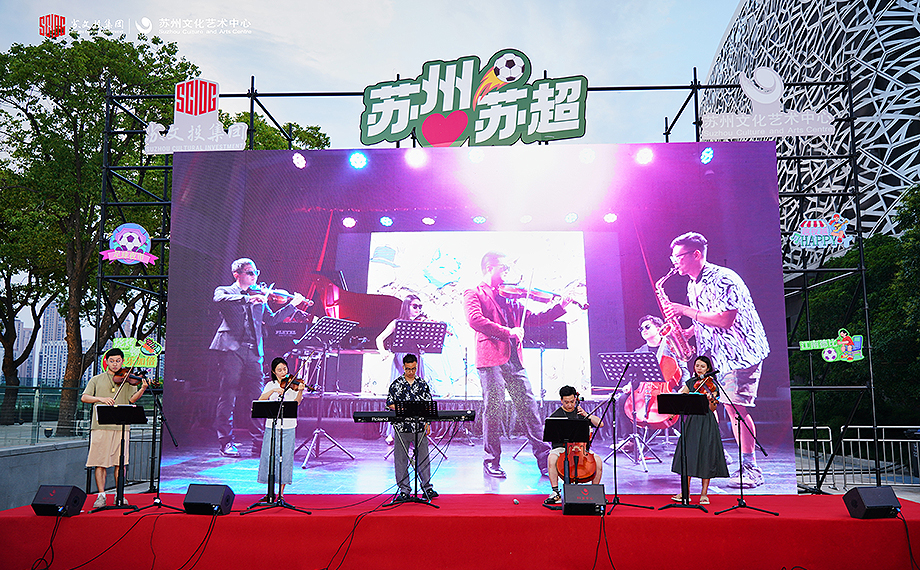 目光轉向現代傳媒廣場、蘇州文化藝術中心湖濱廣場,球迷觀賽的“熱力值”同樣拉滿。作為夏夜市集頂流IP,傳媒之夜開啟“蘇超”模式,夜市云集40余家潮流“好市”,包括品牌餐飲、江南甄選、袞展文創等,滿足球迷看賽一切期待;足球魔方——籠式足球則讓市民體驗競技運動樂趣,在360°全圍擋的燈光籠中,快節奏攻防轉換不斷進行,街頭足球的即興創造力盡顯。而在蘇州文化藝術中心湖濱廣場,球賽的激情與多元文化的魅力交織,這里有豐富多樣的美食,熱愛生活、會玩有趣的生活藝術家,現場的演出更讓這個夏夜顯得與眾不同。