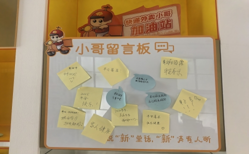 這里召開(kāi)了“新就業(yè)群體座談會(huì)”,通過(guò)面對(duì)面與美團(tuán)、餓了么、叮咚買(mǎi)菜等小哥交流,了解他們的實(shí)際需求等。客廳內(nèi)設(shè)置有“小哥留言板”,讓您心煩可傾訴、“新”聲有人聽(tīng)。