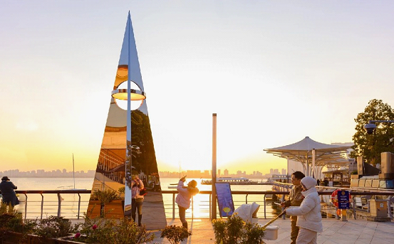 Named “Wen Jing”, one installation draws inspiration from a paper airplane and a rising rocket. Boasting polished stainless steel surfaces, it has previously toured cities like Shenzhen, Hangzhou and Shanghai, earning high acclaim. Reflecting the lake’s shimmering waves, clear skies and urban skyline, it creates an intriguing sense of spatial displacement.