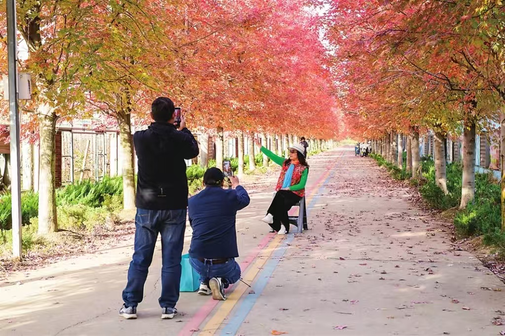 昨天,園區陽澄湖半島浦田生態農業園紅楓大道丹楓如火,吸引了眾多游客前來賞楓。